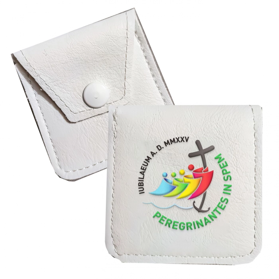 Portarosario bianco, delle dimensioni di 7,5x7,5 cm, con bottoncino clip per la chiusura e logo ufficiale del Giubileo Pellegrini di Speranza del 2025. Realizzato in similpelle, è ideale per portare sempre con sè il rosario per pregare ma all'occorrenza può anche diventare un portamonete.