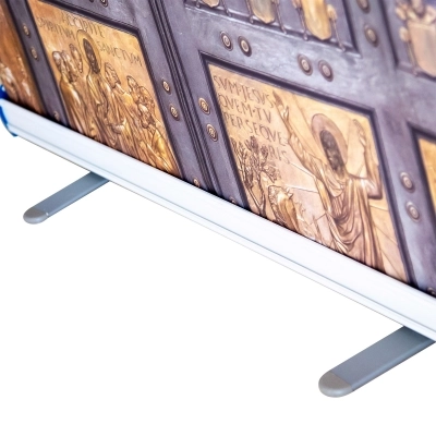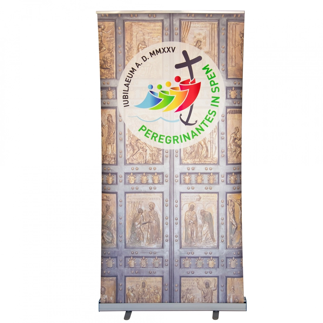 Pratico roll up delle dimensioni di 100x200 cm, raffigurante la Porta Santa con al centro il logo ufficiale del Giubileo Pellegrini di Speranza del 2025. Realizzato in poliestere, con supporti in plastica, è ideale da esporre nei luoghi in cui verranno effettuati eventi o celebrazioni per il Giubileo.