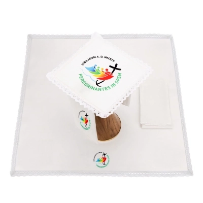 Completo da Messa, realizzato in misto lino e cotone di alta qualità, con al centro il logo ufficiale del Giubileo Pellegrini di Speranza 2025. Il servizio è composto da: Palla copricalice (17 x 17 cm), Corporale (45 x 45 cm), Purificatoio (46 x 23 cm) e manutergio (46 x 24 cm).