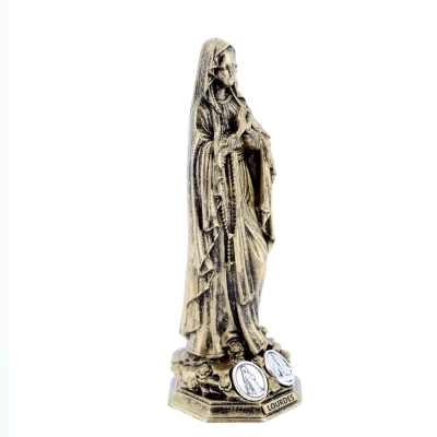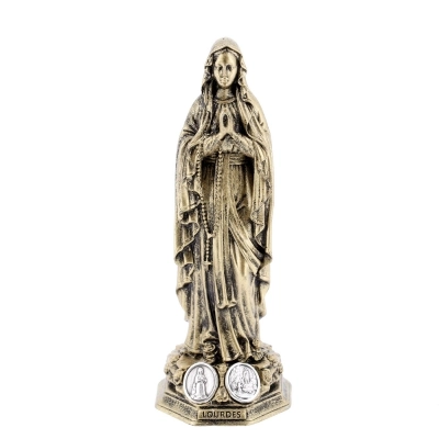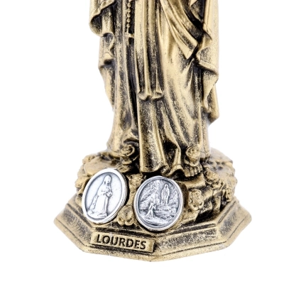 Bellissima statua della Madonna di Lourdes (dell'altezza di 10 cm) realizzata interamente in resina bronzata, dotata di medaglia di Lourdes argentata e base. Ideale per essere esposta in qualsiasi ambiente domestico. Realizzata in Italia con innovative ed avanzate tecnologie, da un'azienda esperta nel settore. Dopo la bronzatura la statua viene immersa in una vernice nera e successivamente spazzolata a mano, in questo modo tutti i bellissimi dettagli della stutua rimangono ben visibili.