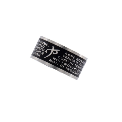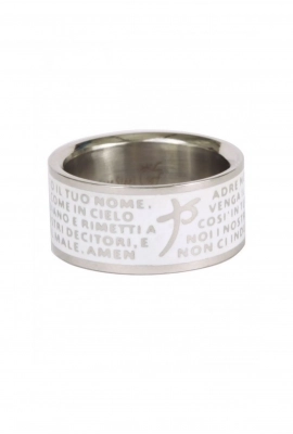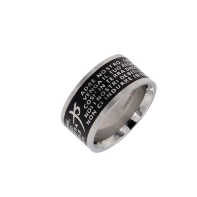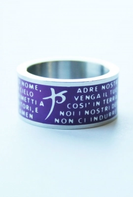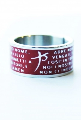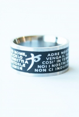Anello unisex in acciaio 316L (anallergico, atossico e antiossidante) con la preghiera del Padre Nostro in italiano incisa in rilievo con finitura lucida, su fondo smaltato colorato. Gli anelli presentano una smussatura interna per semplificarne l'indossabilità. Comodo da indossare quotidianamente, fornito con la sua scatolina diventa un bellissimo regalo anche da uomo.