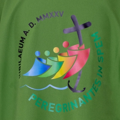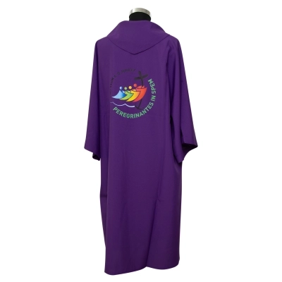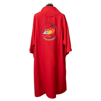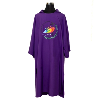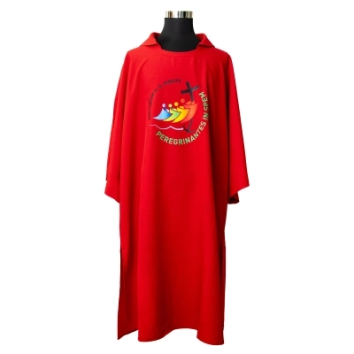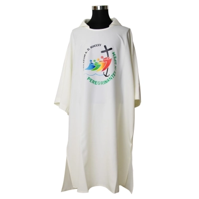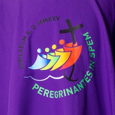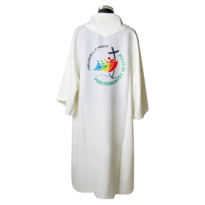 Dalmatica in 100% poliestere, con ricamo del logo ufficiale del Giubileo Pellegrini di Speranza 2025 e scritta in latino, sia davanti che dietro. Prodotta interamente in Italia, da un'azienda di artigiani esperti che da molti anni opera nel settore dei paramenti sacri, creando prodotti artigianali e di altissima qualità.