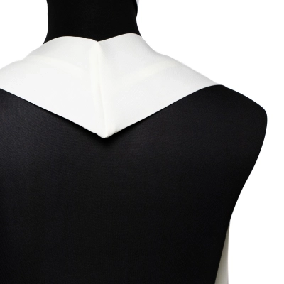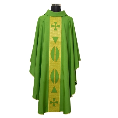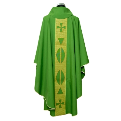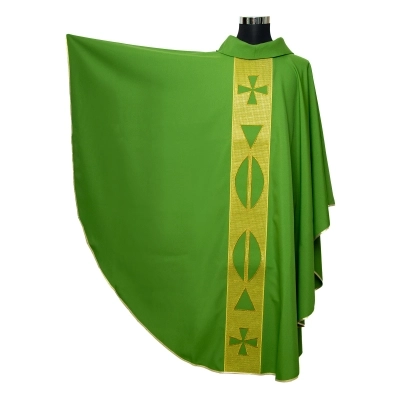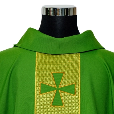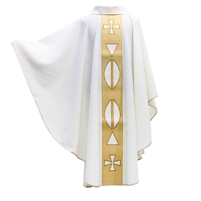 Casula sacerdotale, realizzata in 100% poliestere, con fascione centrale ricamato in negativo con filo dorato. Il ricamo in negativo è una tecnica per cui viene ricamato lo sfondo intorno al disegno che si vuole realizzare, lasciando così che sia la stoffa stessa a creare il disegno voluto. Prodotta interamente in Italia, da un'azienda di artigiani esperti che da molti anni opera nel settore dei paramenti sacri, creando prodotti artigianali e di altissima qualità.