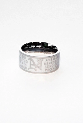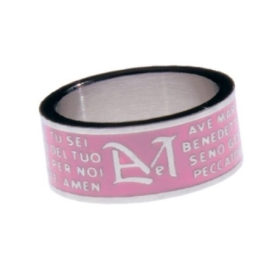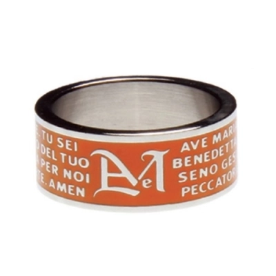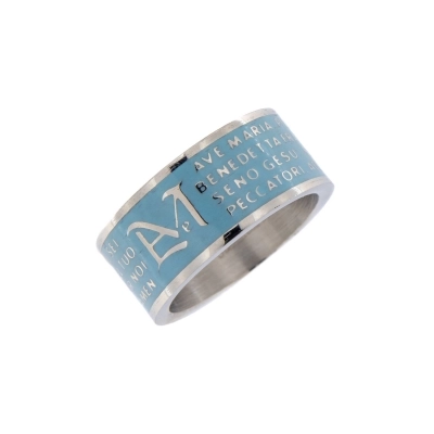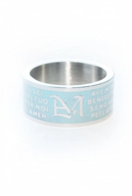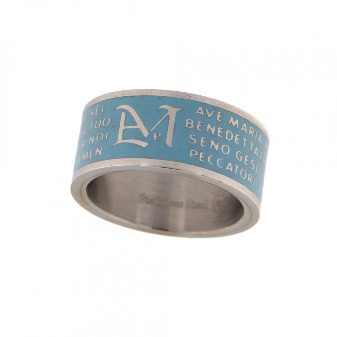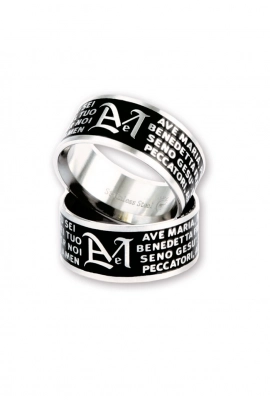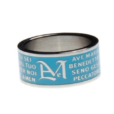Anello unisex in acciaio 316L (anallergico, atossico e antiossidante) con la preghiera dell' Ave Maria in italiano incisa in rilievo con finitura lucida, su fondo smaltato colorato. Gli anelli presentano una smussatura interna per semplificarne l'indossabilità. Comodo da indossare quotidianamente, fornito con la sua scatolina diventa un bellissimo regalo anche da uomo.