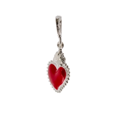Ciondolo in argento 925, raffigurante il Cuore Votivo con la fiamma in alto, dall'altezza totale di 2,5 cm (il solo cuore votivo senza gancio è alto 1,6cm). Le dimensioni permettono di indossarlo ovunque si voglia, per esempio può essere appeso ad un bracciale oppure ad una catenina. Pratico e leggero da indossare tutti i giorni. Realizzato in Italia da un'azienda specializzata nella produzione artigianale di articoli in filigrana di argento.