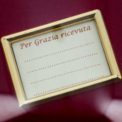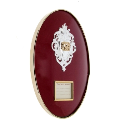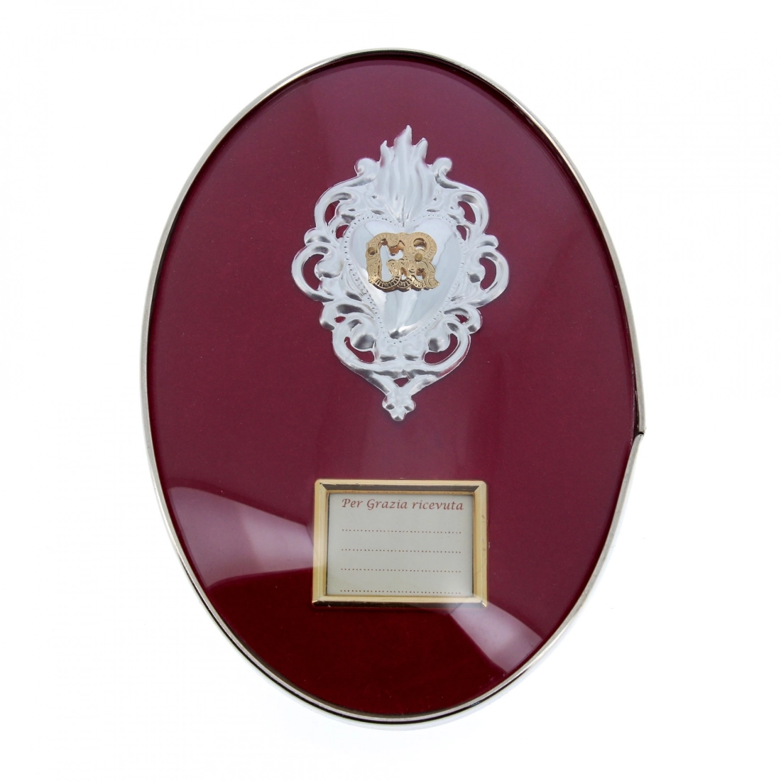 Quadretto Cuore Votivo (Ex voto) ovale, con fondo in velluto rosso e cuore votivo in metallo argentato con lettere GR (Grazia ricevuta) in metallo dorato. Il quadro è dotato di uno spazio personalizzabile, in cui è possibile scrivere la grazia ricevuta, estraibile grazie alla sagomatura posta sul retro del quadro. Il quadro è dotato di gancio per poterlo appendere.
