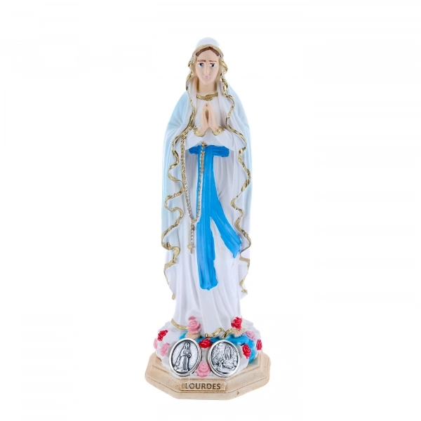 Bellissima statua della Madonna di Fatima (dell'altezza di 15 cm) realizzata interamente in resina colorata, dotata di medaglia di Fatima in metallo argentato e base di appoggio. Ideale per essere esposta in qualsiasi ambiente domestico. Realizzata in Italia con innovative ed avanzate tecnologie, da un'azienda esperta nel settore.