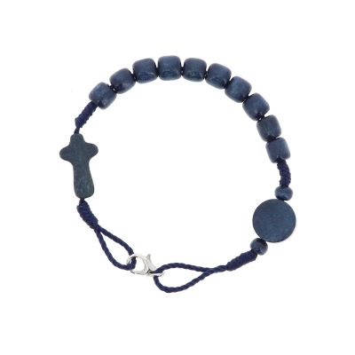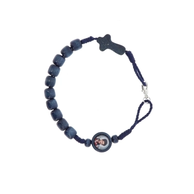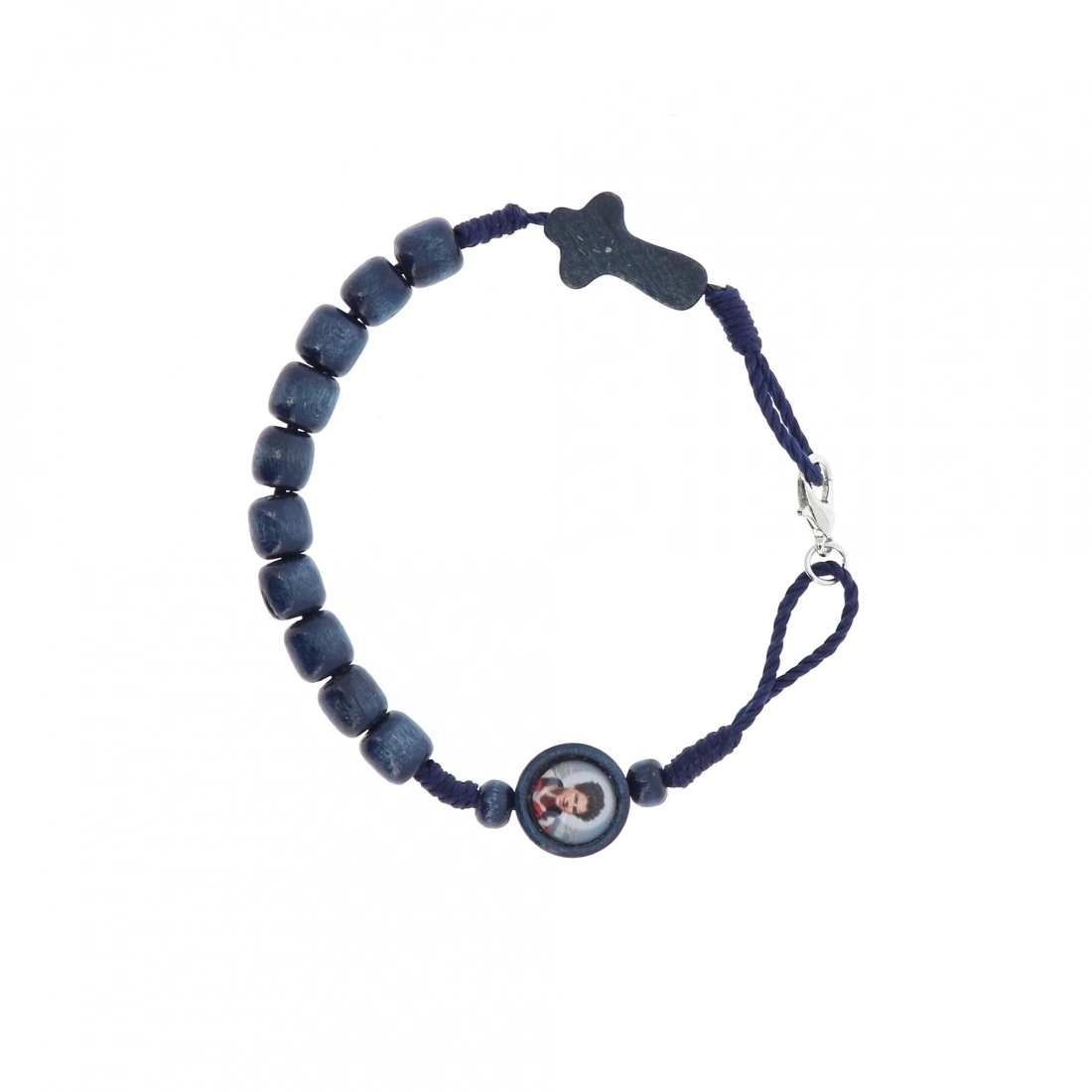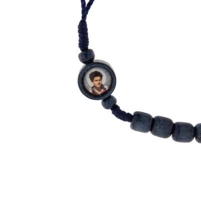 Bracciale con 10 grani in legno a forma di cubetto blu (che compongono una decina del Rosario), con una crocetta sempre in legno blu e una medaglia con un adesivo che raffigura il volto di Carlo Acutis. Comodo e pratico da indossare tutti i giorni, grazie al gancetto che ne consente l'apertura e utile per poter pregare il Santo Rosario. E' ideale da regalare a ragazzi come promemoria tangibile della sua testimonianza di vita e per incoraggiare a seguire il suo esempio.
