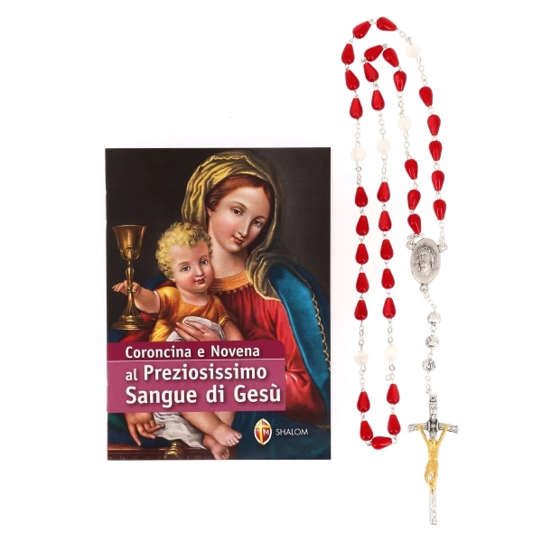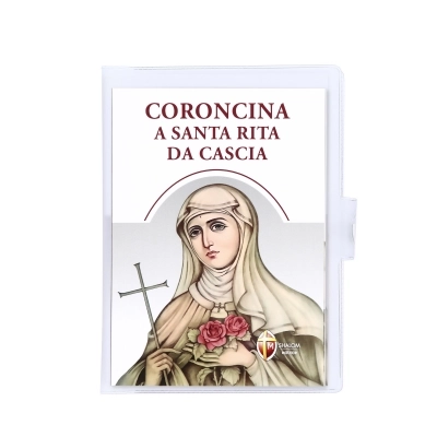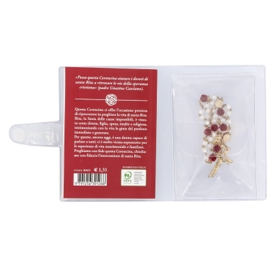Confezione pratica e tascabile in morbido PVC con chiusura a strappo (formato 11x14,5 cm), contenente il libretto "Coroncina a Santa Rita da Cascia" e l'elegante Corona a Santa Rita, realizzata con grani in cristallo color latte da 6 mm, alternati da bellissime rose rosse, simbolo da sempre associato alla Santa delle cause impossibili.
