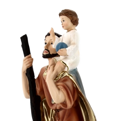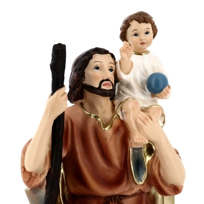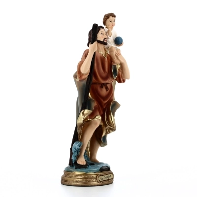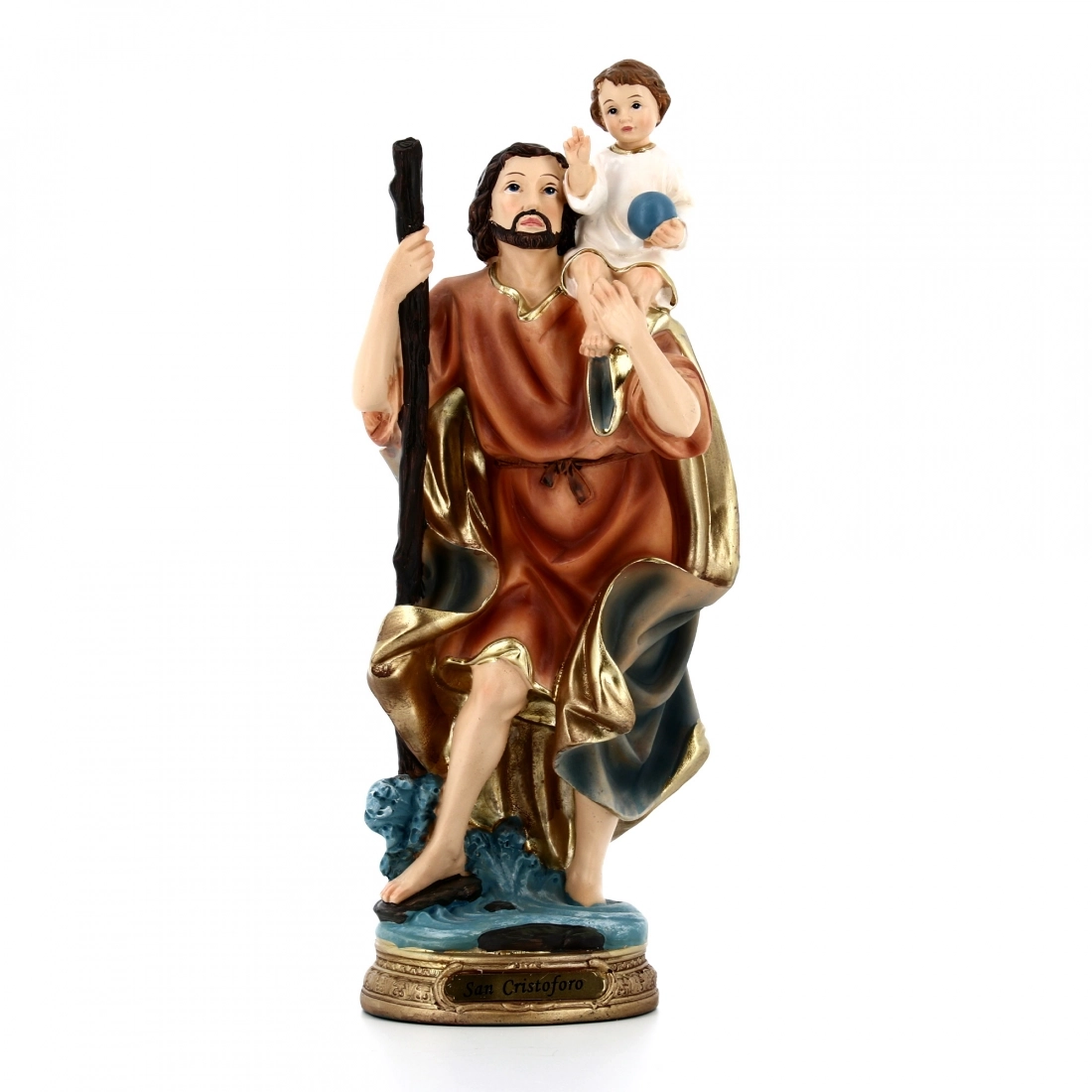 Statua di San Cristoforo con Gesù bambino sulle spalle, realizzata in resina, dell'altezza di 30 cm e dipinta a mano. San Cristoforo è una figura molto venerata nella tradizione cristiana italiana. È considerato il patrono dei viaggiatori e dei conducenti, e la sua iconografia è spesso associata alla protezione durante i viaggi. La leggenda narra che fosse un gigante che, dopo aver servito vari re, decise di dedicare la sua vita a Dio. La storia più famosa di San Cristoforo racconta infatti di come aiutò un bambino ad attraversare un fiume. Durante il tragitto, il bambino si rivelò essere Cristo, e questo gesto di carità gli valse la santità.