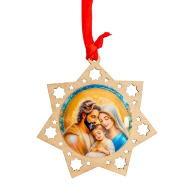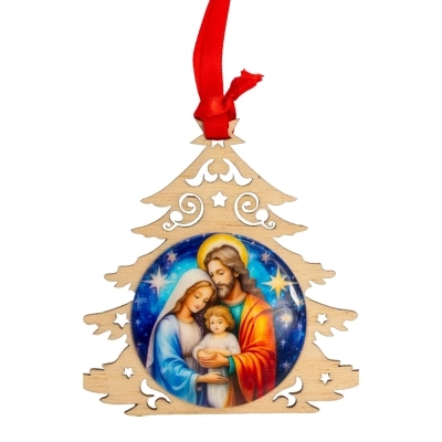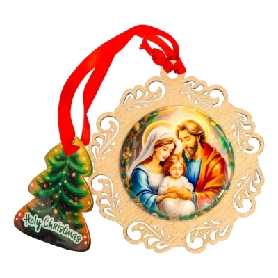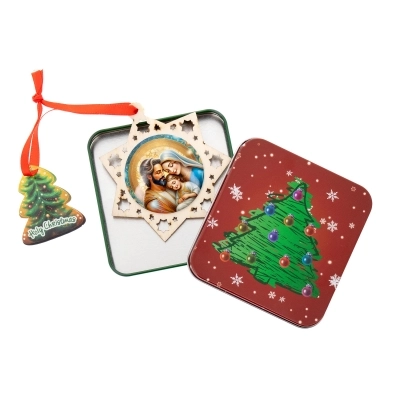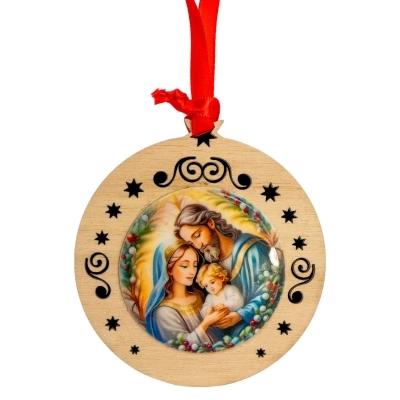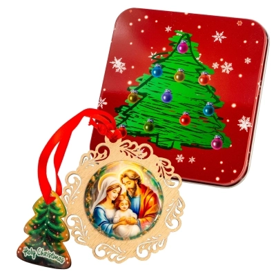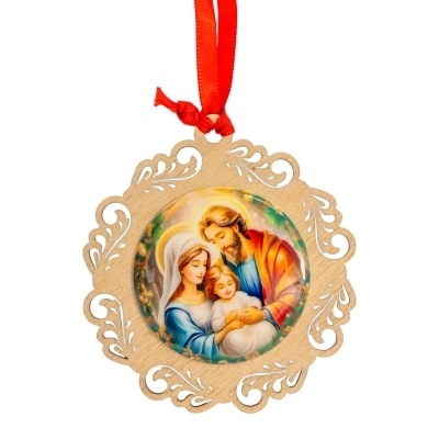 Delizioso addobbo natalizio in legno, modelli assortiti (del diametro di 11 cm), raffigurante la Sacra Famiglia su medaglia resinata; ideale da appendere all'albero di Natale. L'articolo è confezionato in una graziosa scatolina in metallo a tema natalizio ed è quindi un'ottima ed economica idea regalo!