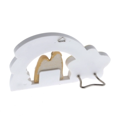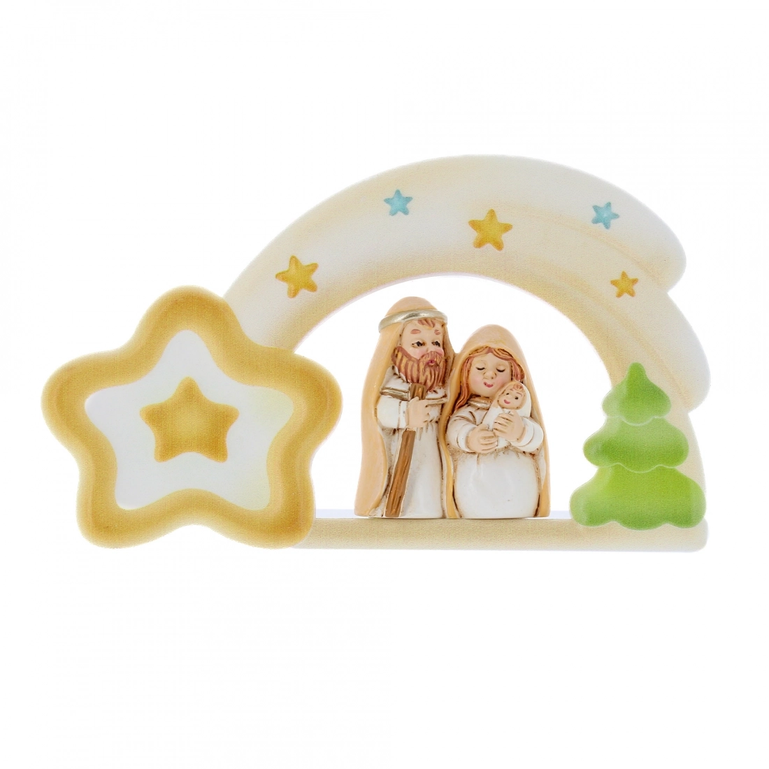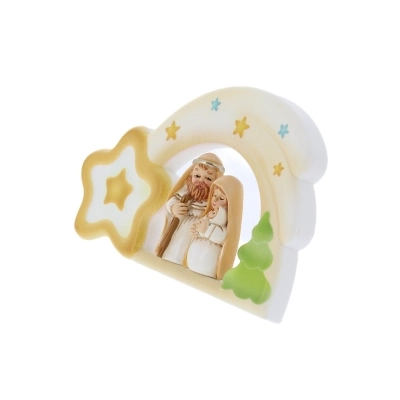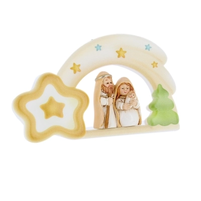 Quadretto in resina, da appoggio, raffigurante la Natività sotto una grande stella cometa che con l'abete posto sul lato opposto, riproducono una capanna per richiamare il luogo dove è nato Gesù. Il quadretto è dotato di piedistallo in metallo per poterlo appoggiare. Le dimensioni ridotte lo rendono un carinissimo regalo da donare a chiunque per augurare un Santo Natale sotto la protezione della Sacra Famiglia.