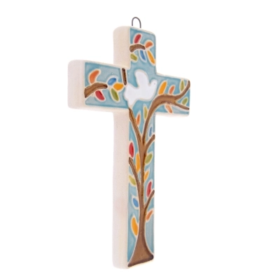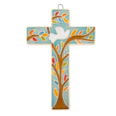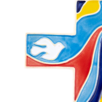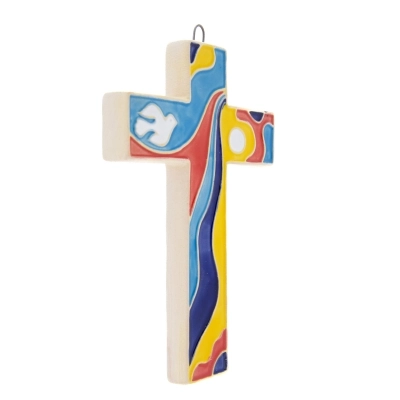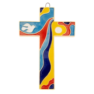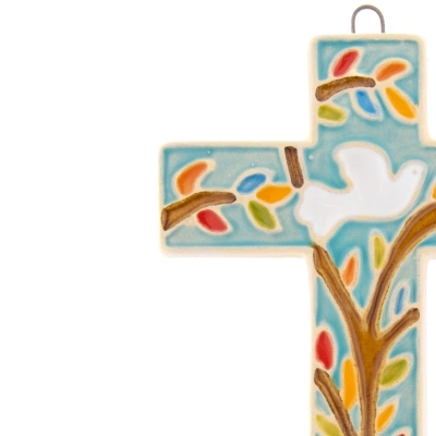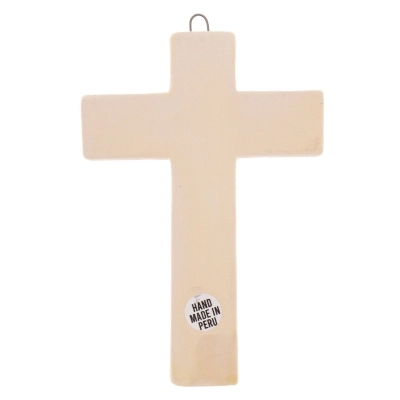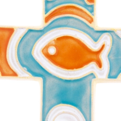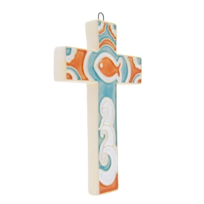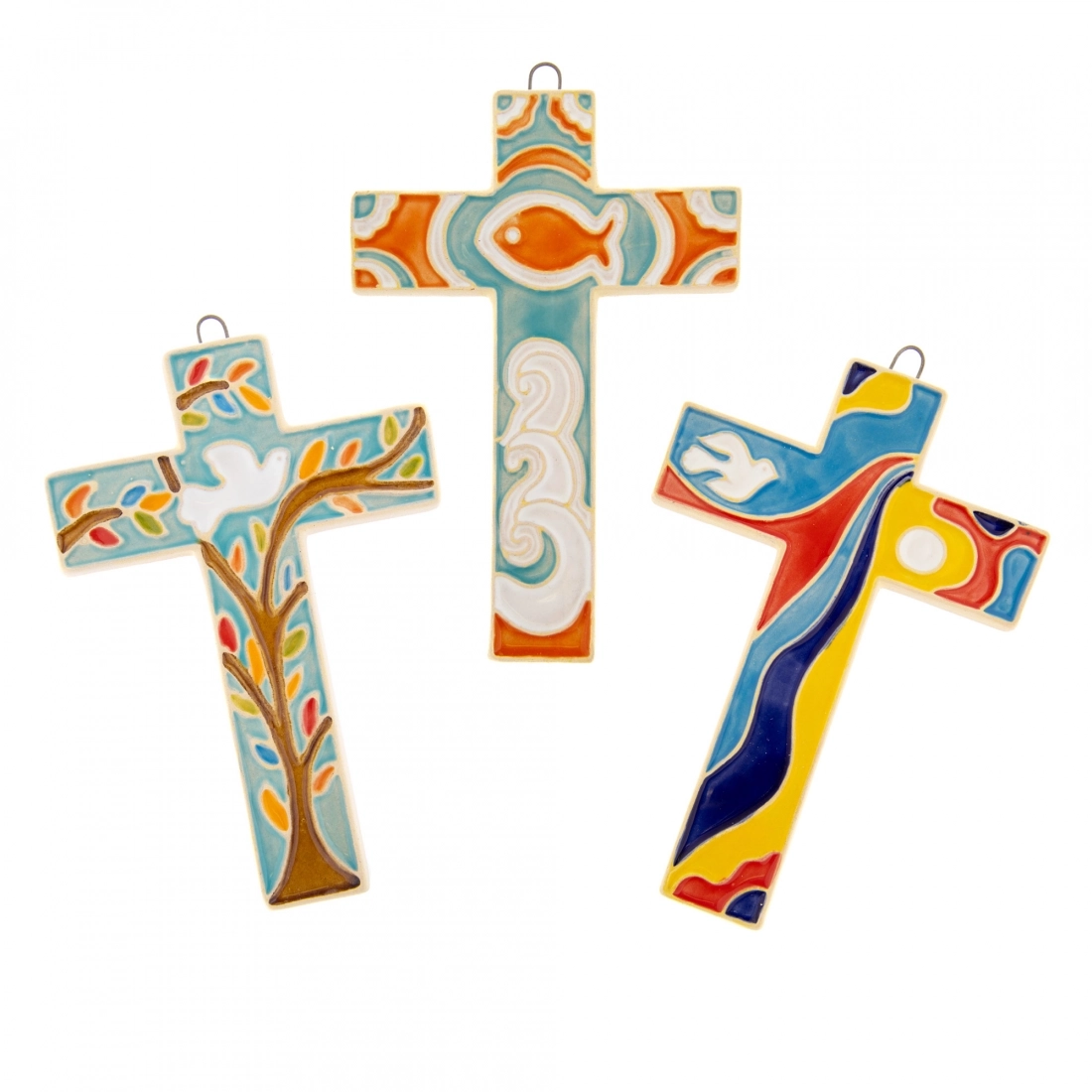 Croce smaltata in terracotta, realizzata e dipinta completamente a mano, con gancetto per essere appesa. I colori dei tre modelli disponibili sono molto vivaci e si adattano perfettamente ad ogni ambiente della casa, in particolare nella cameretta di un bambino.