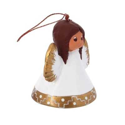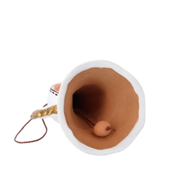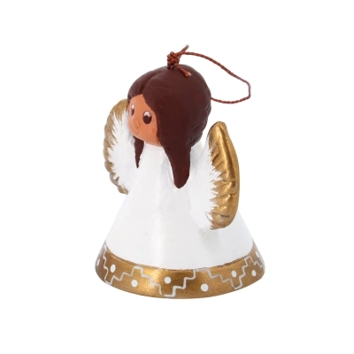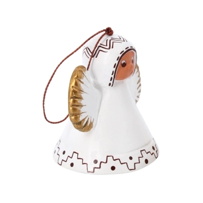 Carinissima coppia di angeli con campanella, realizzate in terracotta e dipinte a mano, con cordino per essere appese all'albero di Natale. Dimensioni: 5,5x7 cm.