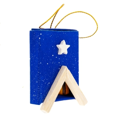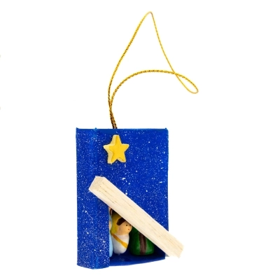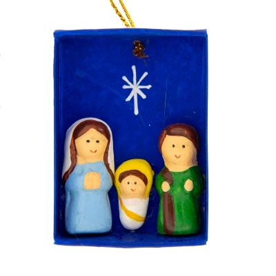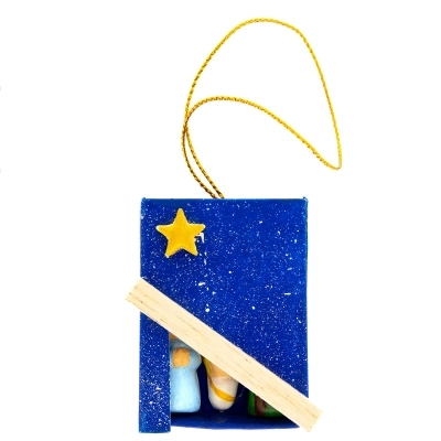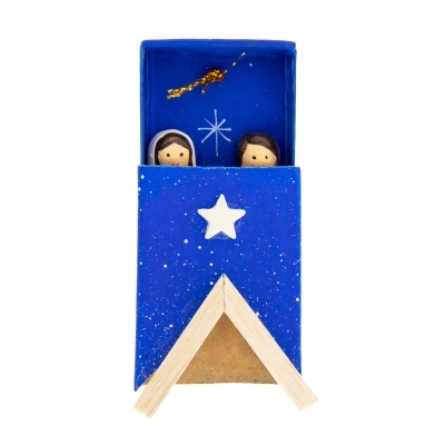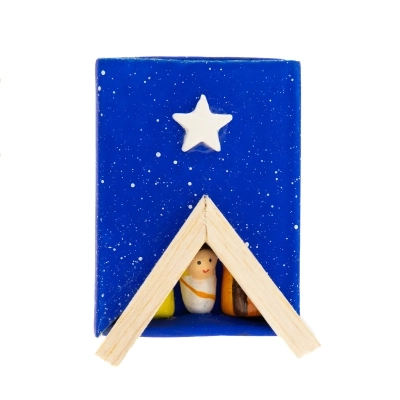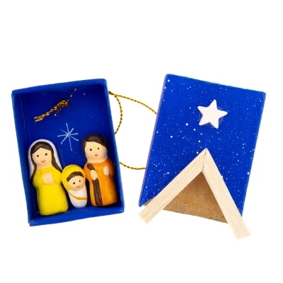 Carinissima scatolina blu in carta con apertura a cassetto, che ricorda la scatola dei fiammiferi, con all'esterno applicazioni in legno. All'interno della scatolina c'è la Sacra Famiglia in terracotta incollata alla scatola stessa. L'articolo è dotato di laccetto dorato con cui è possibile appenderlo, ad esempio all'albero di Natale per arricchirlo con oggettistica sacra ed equo-solidale.