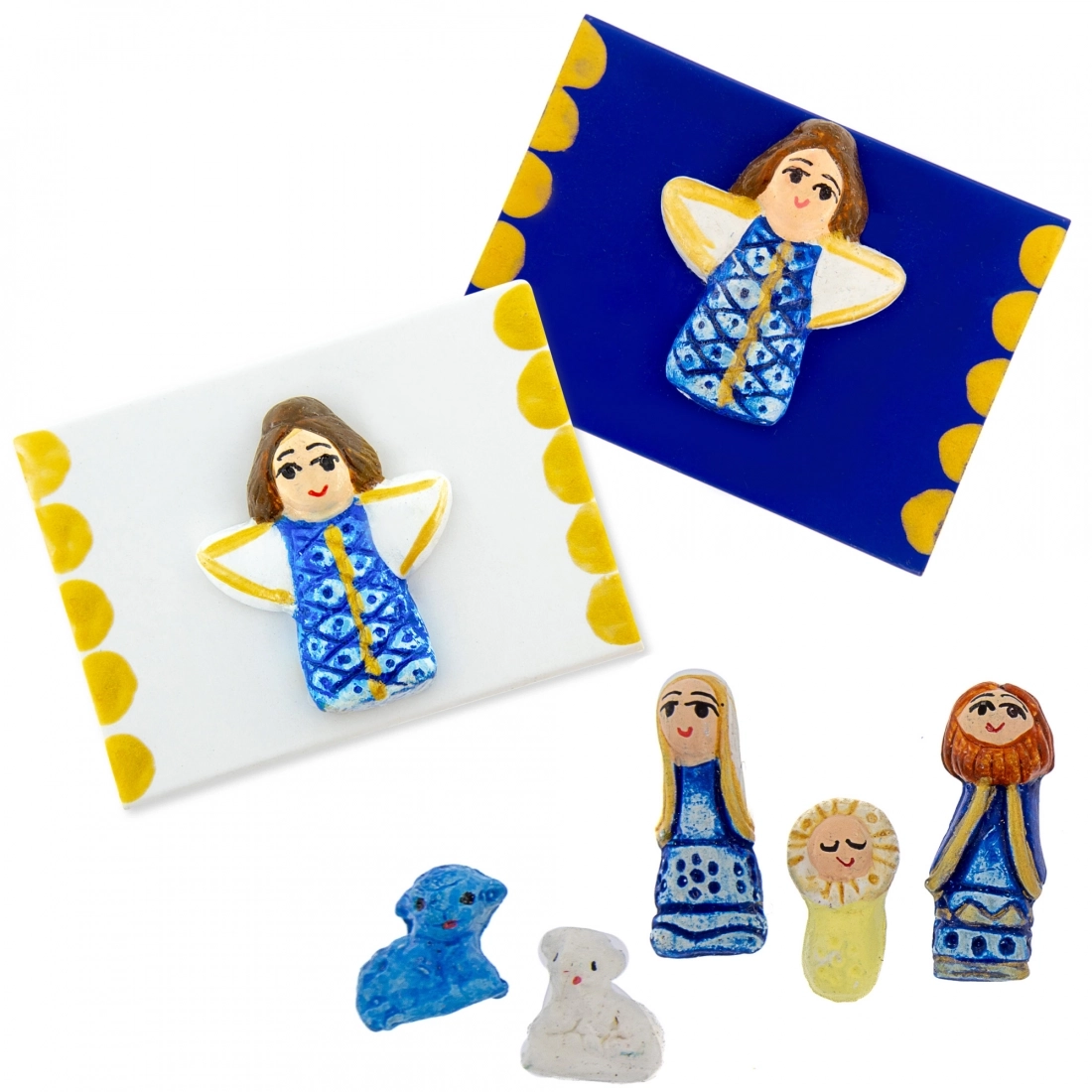 Piccolo presepe formato da 5 pezzi in terracotta all'interno di una scatolina in cartoncino rigido e angelo applicato. Il tutto è sapientemente dipinto a mano. Pensiero carinissimo da regalare a Natale.
