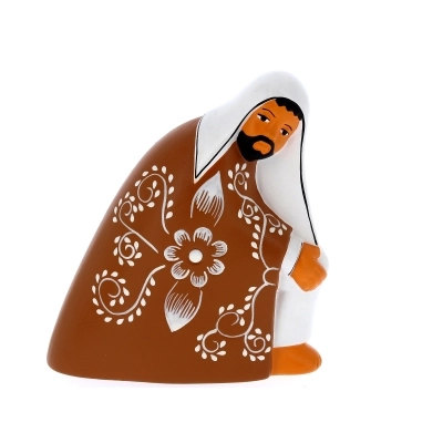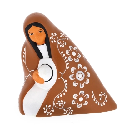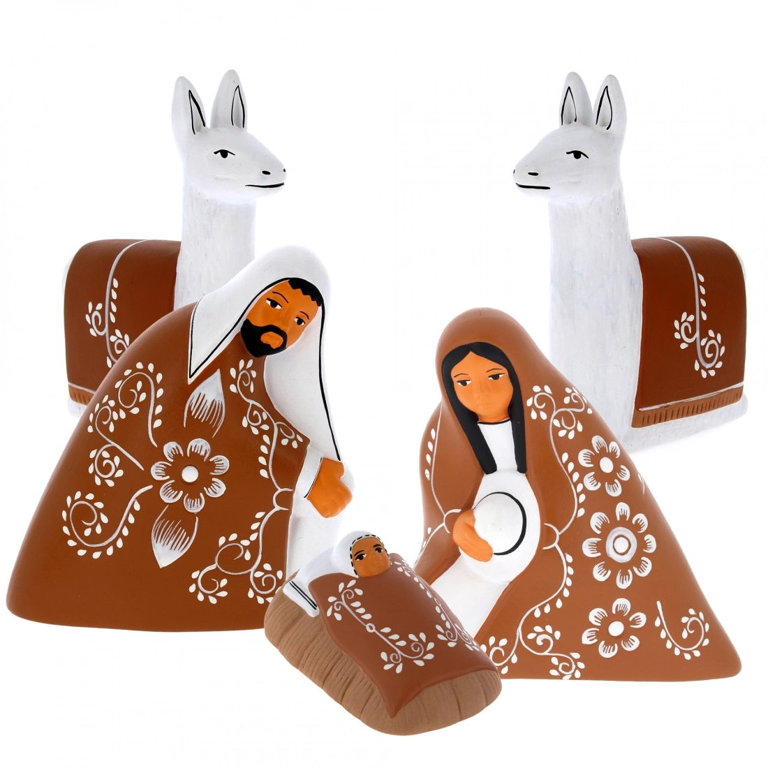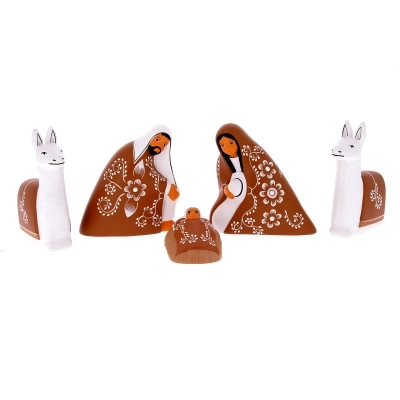 Pesepe in terracotta lavorata e dipinda completamente a mano da esperti artigiani. Questo presepe sudamericano, unico nel suo genere, è formato da cinque pezzi: la Sacra Famiglia e due lama. Bellissime sono le decorazioni che adornano il mantello della Madonna, la copertina del Bambinello e la sella dei lama.