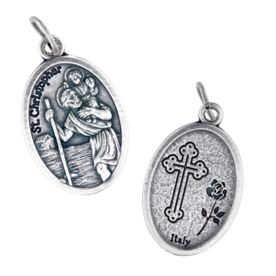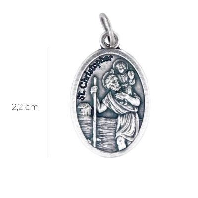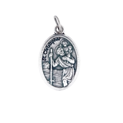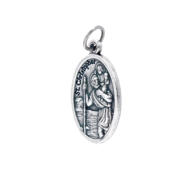 Medaglia ovale di San Cristoforo, in zama. La medaglia è dotata di anellino da utlizzare come pendente in una catenina, per essere indossata al collo. Grazie alla sua dimensione è comoda da portare sempre con sè, per esempio dentro al portafoglio o portamonete. La medaglia è ben rifinita e tutti i particolari sono ben visibili e dettagliati. La medaglia è realizzata in Italia da un'azienda artigianale e leader nella produzione di medaglie. San Cristoforo è il patrono degli autisti, per cui diventa un bel pensiero da donare a chi deve affrontare lunghi viaggi o a chi passa tanto tempo in macchina.