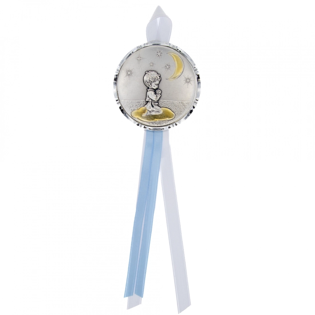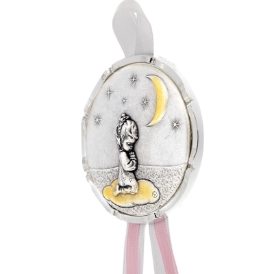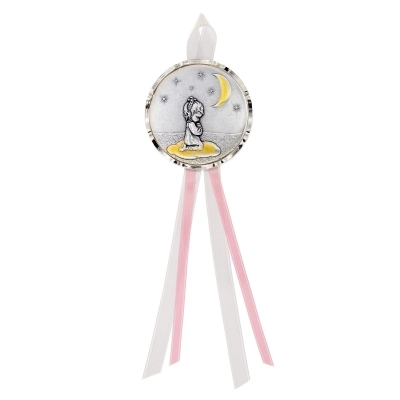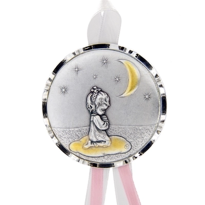 Capoculla rotondo in zama con nastrino abbinato rosa o celeste e raffigurante un bambino o bambina che prega. Confezionato nella sua scatolina originale, è un'ottima idea regalo in occasione di una nascita o di un Battesimo. Realizzato in Italia da un'azienda leader per la produzione di medaglie e oggettistica in zama.
