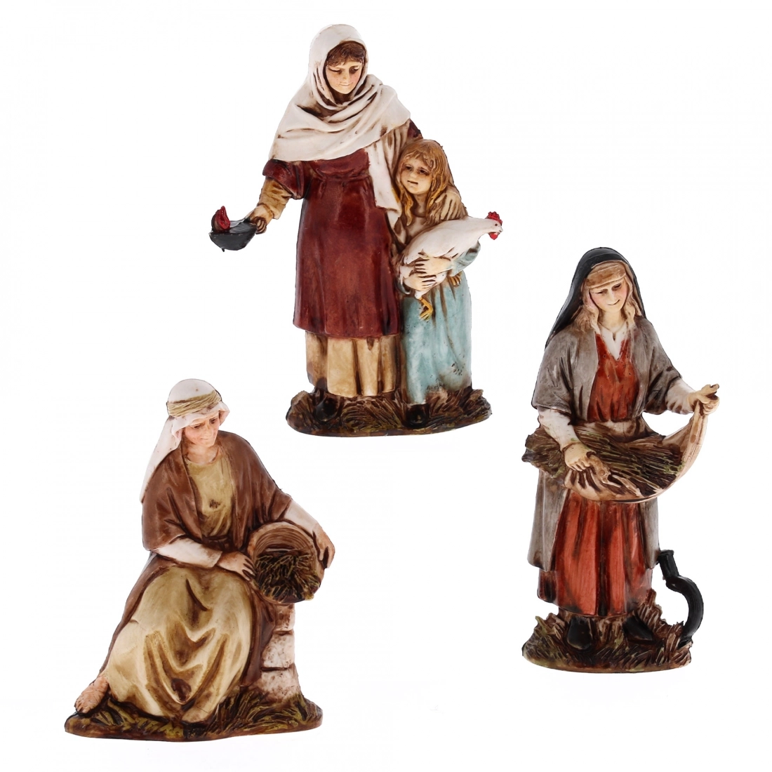 Set di 3 donne, pastorelle in stile arabo realizzate in plastica pvc, serigrafate e rifinite a mano. Queste donne sono ritratte durante le loro occupazioni abituali e sono perfette per arricchire il presepe. L'altezza di ogni personaggio è di circa 10 cm