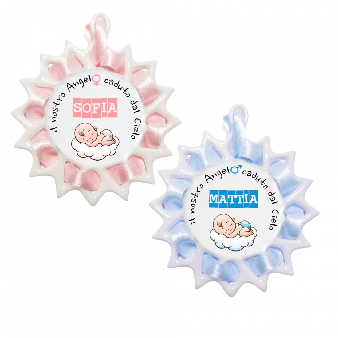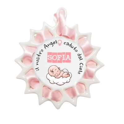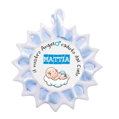 Carinissimo sopraculla in porcellana personalizzabile con il nome del bimbo. È confezionato con un nastrino in raso azzurro o rosa abbinato al capoculla che rende il prodotto più raffinato e ricco. Perfetto come idea regalo per una nascita. Da utilizzare come sopraculla, ma anche ideale come elemento di arredo nella cameretta del bimbo.