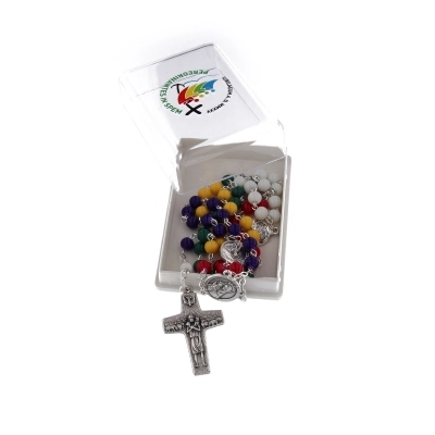 La corona del rosario è confezionata in una bella scatolina in plastica bianca e trasparente con logo del Giubileo.
