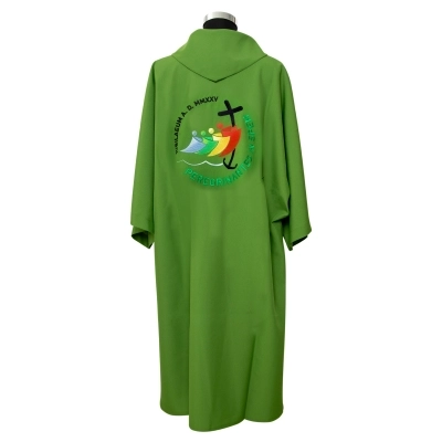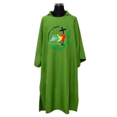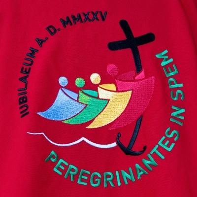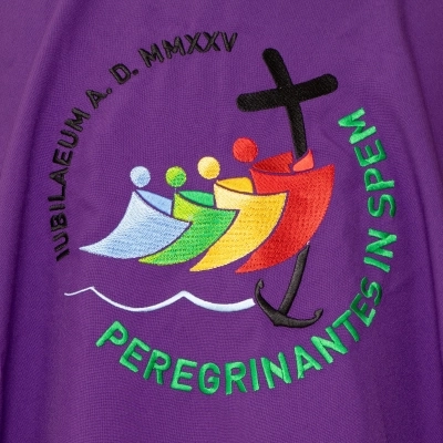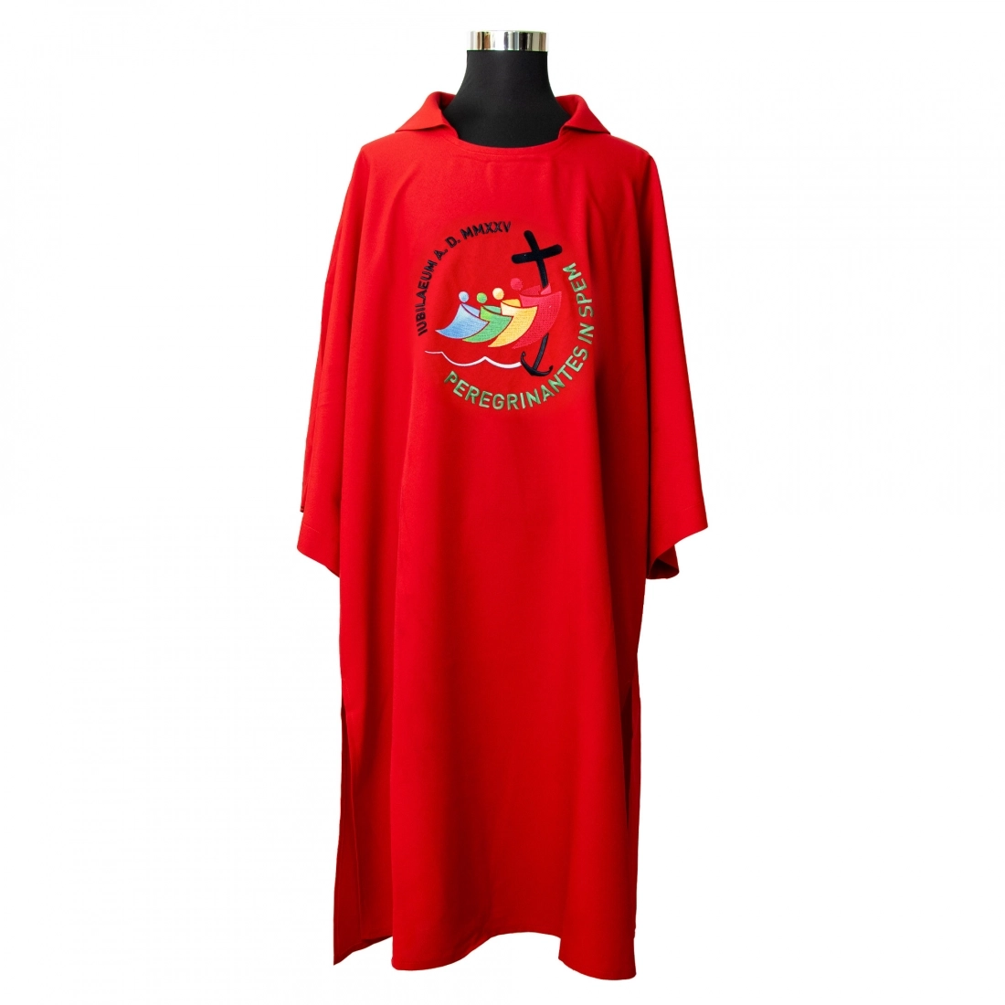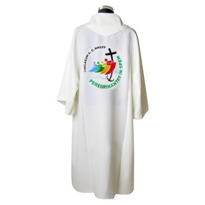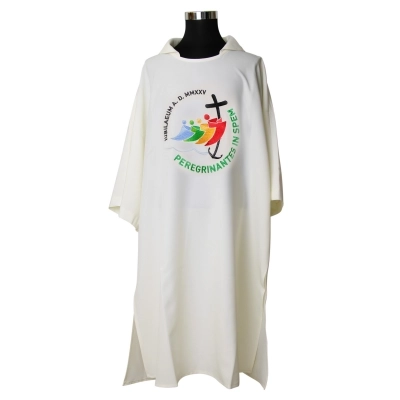 Dalmatica in 100% poliestere, con stampa del logo ufficiale del Giubileo Pellegrini di Speranza 2025 e scritta in latino, sia davanti che dietro. Prodotta interamente in Italia, da un'azienda di artigiani esperti che da molti anni opera nel settore dei paramenti sacri, creando prodotti artigianali e di altissima qualità.