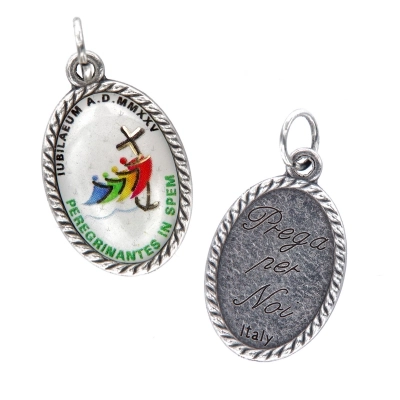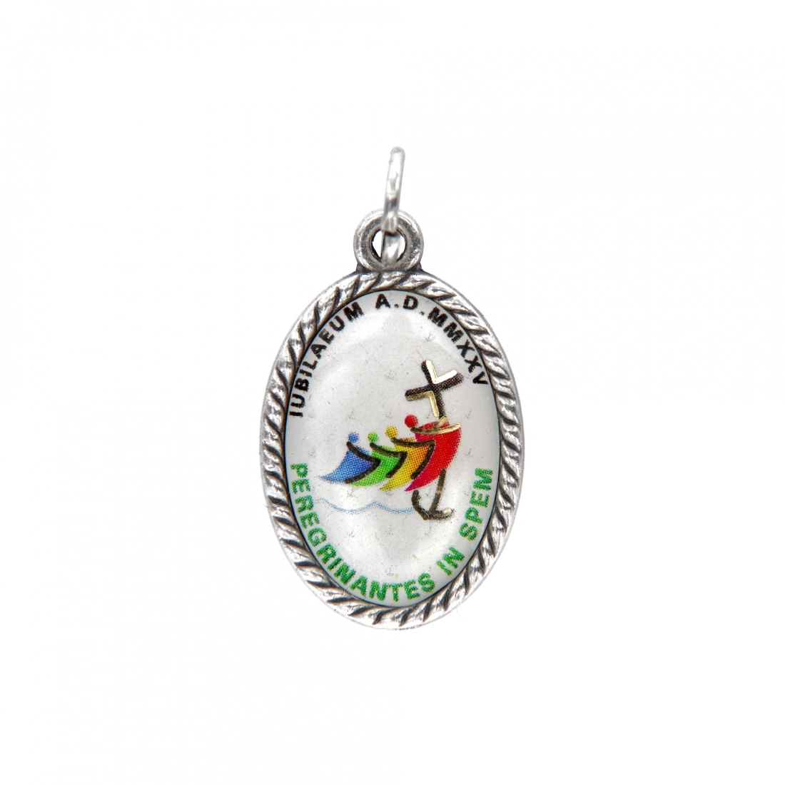 Piccola medaglia delle dimensioni di 2,5x1,5 cm, realizzata in metallo color argento. Al centro vi è applicato il logo ufficiale del Giubileo 2025 con il motto in latino: " Peregrinantes in Spem", che significa Pellegrini di Speranza".