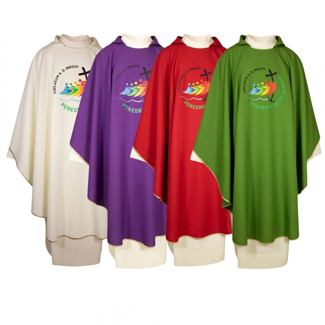 Casula in poliestere con bordo oro, con logo ufficiale del Giubileo Pellegrini di Speranza 2025 e scritta in latino. Il logo è stampato direttamente su tessuto. A completare la casula, una stola coordinata.