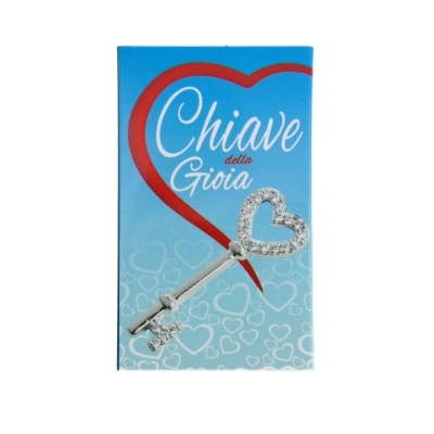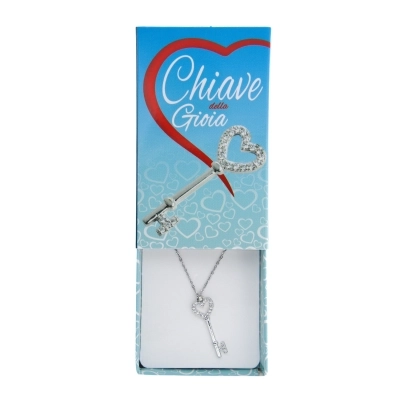 Bellissima collanina con ciondolo a forma di chiave arricchita da strassini per conferire luminosità ed eleganza. E' la chiave della gioia, che apre ogni cuore, da donare con amore a qualcuno di importante. Molto bello e curato il packaging che si apre a cassetto e presenta un' illustrazione nella parte anteriore e un bel pensiero sull'amicizia nella parte posteriore della confezione. Prodotto molto carino da regalare.