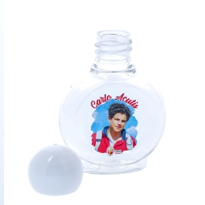 Bottiglia in PVC ideale per l'acqua benedetta, benedizioni pasquali o qualsiasi occasione in cui si voglia distribuire l'acqua benedetta ai fedeli da portare a casa. Con immagine di San Carlo Acutis. Dimensioni 7x4,5 cm. Capienza 40 ml.
