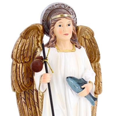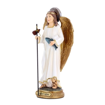 Graziosa e dettagliata statua di San Raffaele Arcangelo, raffigurato con la sua tipica simbologia, che sono il bastone con la borraccia e il pesce. La statua, dai colori brillanti, poggia su una solida base ed è adatta da esporre sia in qualsiasi ambiente domestico. Raffaele, nome che deriva dall'ebraico e vuol dire "Dio ha guarito", è uno dei principali angeli della schiera del Cielo, viene spesso raffigurato che accompagna l'uomo nel suo cammino, per questo può essere donato a chi nella vita deve affrontare lunghi e incerti viaggi. San Raffaele Acangelo è anche protettore dei giovani.