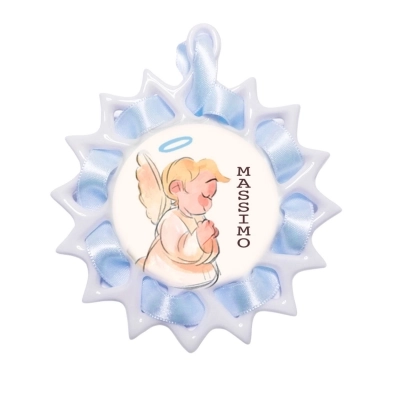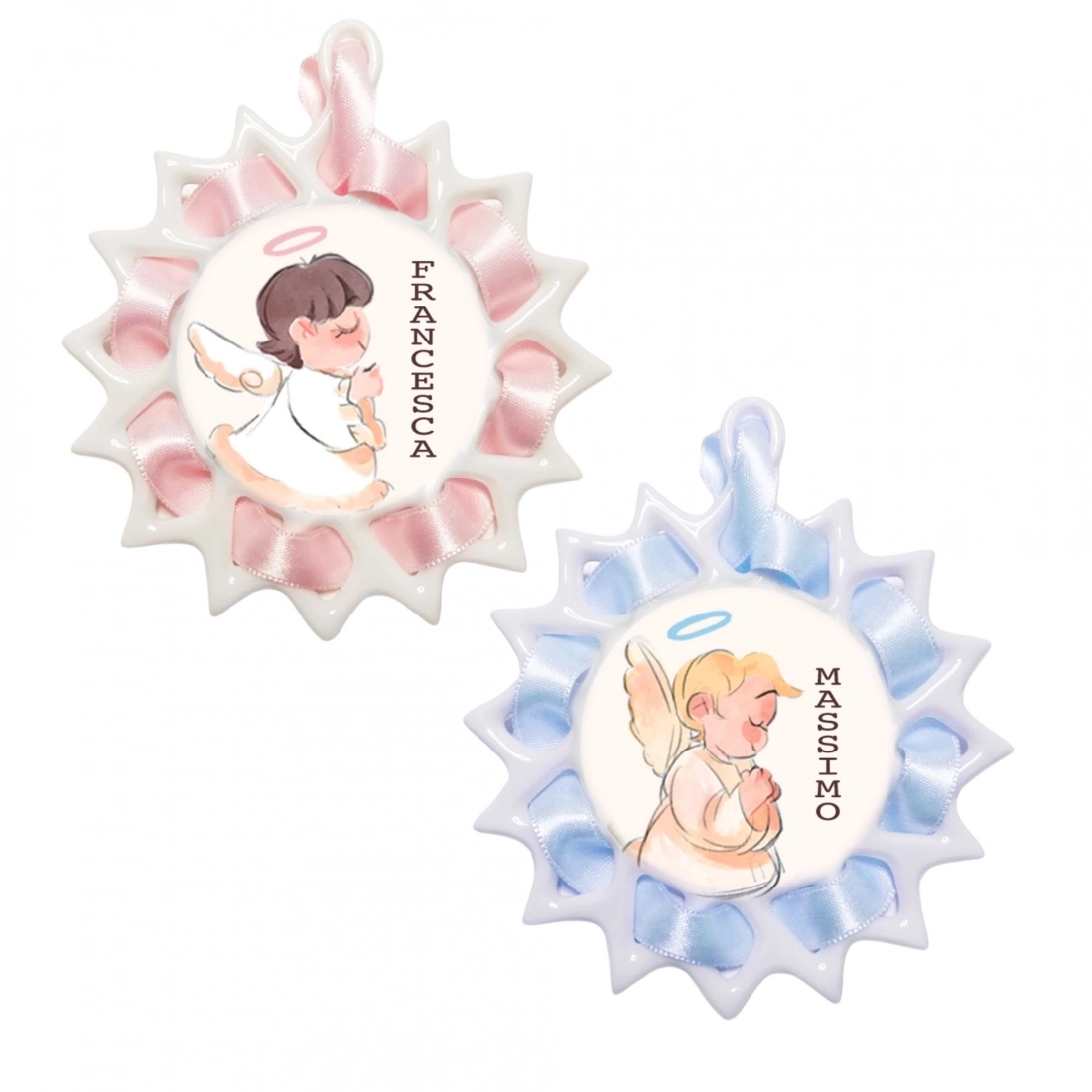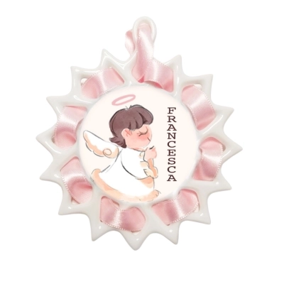 Carinissimo sopraculla in porcellana personalizzabile con il nome della bimba. È confezionato con un nastrino in raso rosa abbinato al capoculla che rende il prodotto più raffinato e ricco. Perfetto come idea regalo per una nascita. Da utilizzare come sopraculla, ma anche ideale come elemento di arredo nella cameretta della bimba.