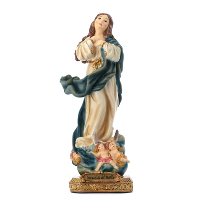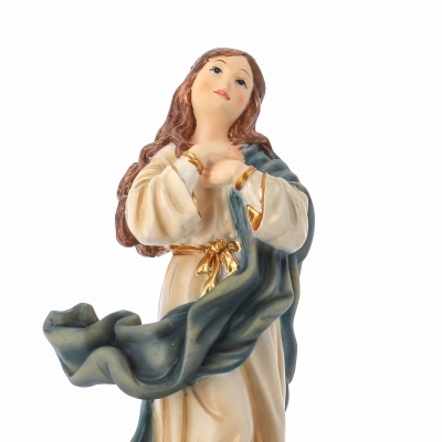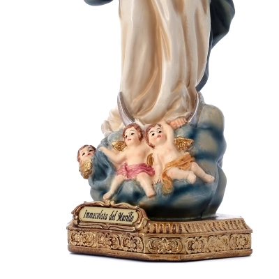 Statua della Madonna Immacolata del Murillo, in resina colorata, dell'altezza di 22 cm. La statua della Madonna Immacolata dipinta da Murillo rappresenta la figura della Vergine Maria senza peccato originale. Questo concetto teologico si riferisce alla credenza cattolica che Maria sia stata concepita senza il peccato originale, in preparazione alla sua missione di madre di Gesù Cristo. La statua di Murillo cattura la purezza e la santità della Madonna Immacolata, simboleggiando la sua grazia divina e la sua vicinanza a Dio. La rappresentazione artistica di Murillo enfatizza la bellezza e la spiritualità della Vergine Maria, offrendo un'interpretazione visiva di questo dogma mariano.