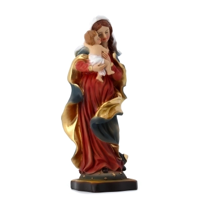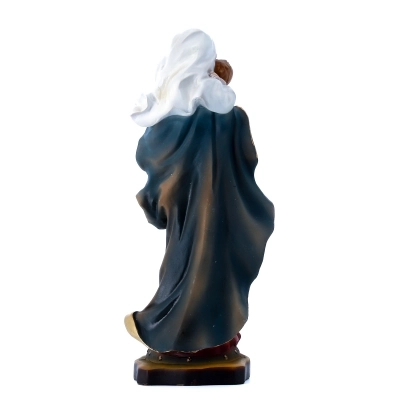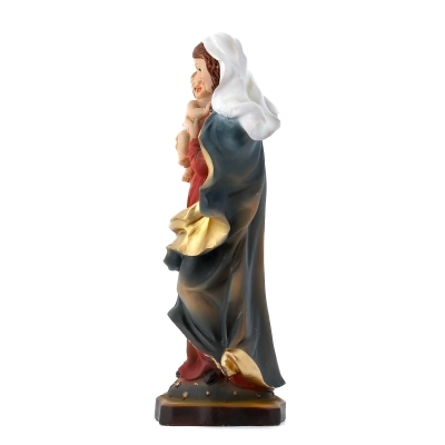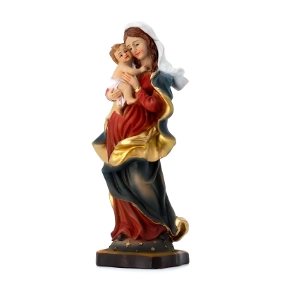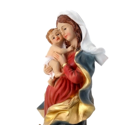 Statua della Madonna con Bambino, in resina colorata, dell'altezza di 20,5 cm. La statua della Madonna con il Bambino rappresenta la Vergine Maria con il suo figlio Gesù. Questa rappresentazione è uno dei simboli più iconici della cristianità e simboleggia l'amore materno, la protezione, la devozione e la sacralità della famiglia. La Madonna con il Bambino è spesso raffigurata in varie pose e stili artistici, ma il tema centrale rimane la relazione affettuosa tra Maria e Gesù come madre e figlio. La statua è un simbolo di fede e venerazione mariana all'interno della tradizione cristiana.