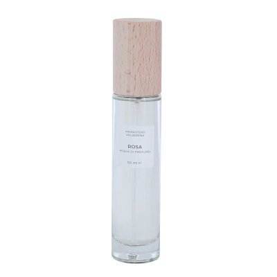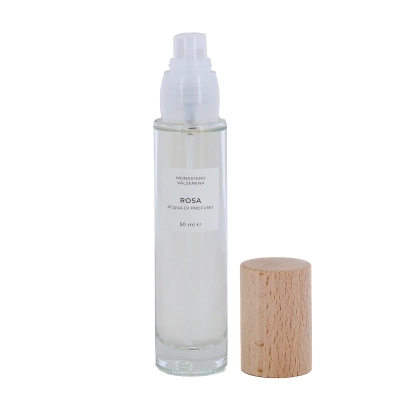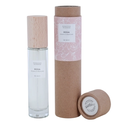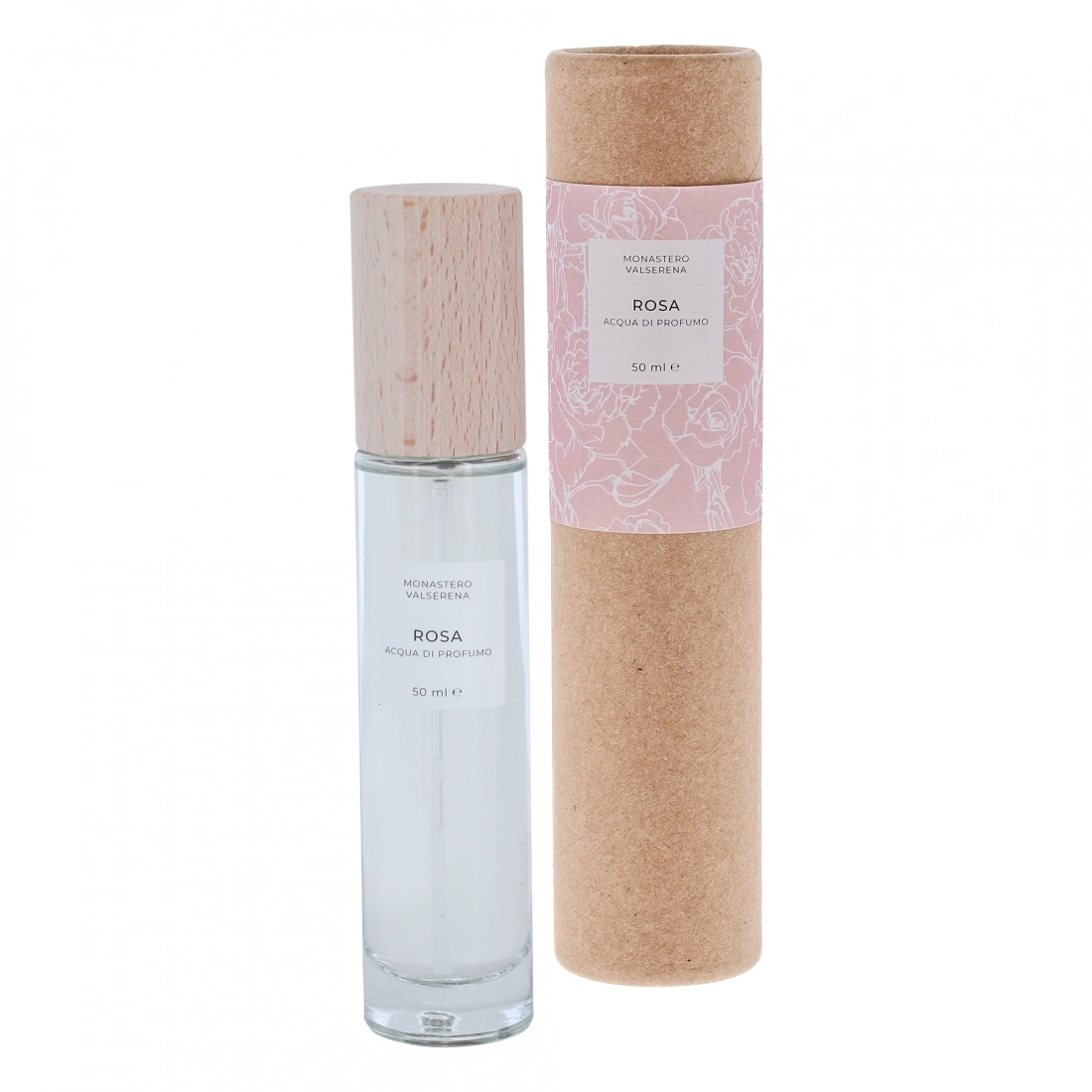 Acqua profumata alla Rosa, in flacone da 50 ml con vaporizzatore, prodotta direttamente dalle monache cistercensi all'interno del Monastero di Valserena. Quest'acqua di profumo ha una fragranza intramontabile, femminile e sofisticata, resa unica dalla combinazione di essenze fiorite, legni e da un morbido e talcato muschio. Note di Rosa, Foglie di Violetta, Iris, legni, Muschio
