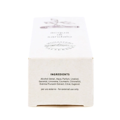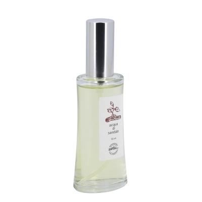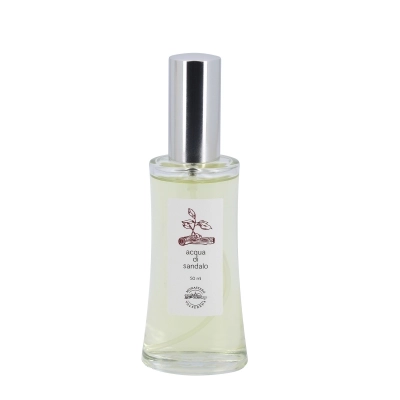 Acqua profumata al Sandalo, in flacone da 50 ml con vaporizzatore, prodotta direttamente dalle monache cistercensi all'interno del Monastero di Valserena. Quest'acqua di Sandalo, con la fragranza della preziosa radice e le sue antiche proprietà toniche rendono particolarmente utile e gradito l’uso della profumazione intensa e decisa. Il profumo al sandalo è noto per le sue caratteristiche calde, avvolgenti e legnose. Il sandalo è una nota aromatica ricca e sensuale, spesso utilizzata in profumeria per le sue proprietà rilassanti e meditative. Le caratteristiche tipiche di un profumo al sandalo includono note legnose, dolci e cremose, che possono creare un'atmosfera avvolgente e sofisticata.