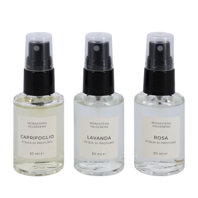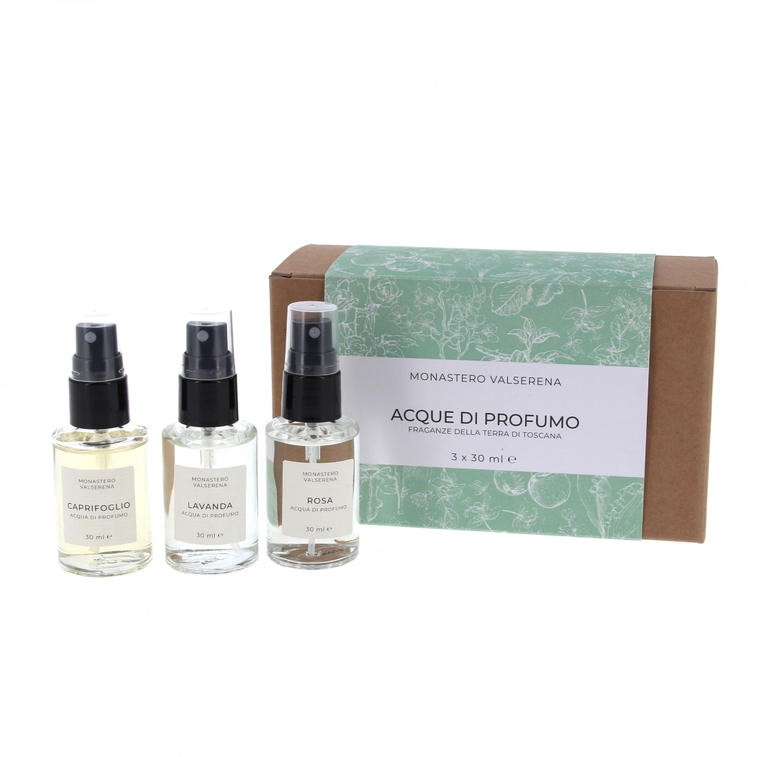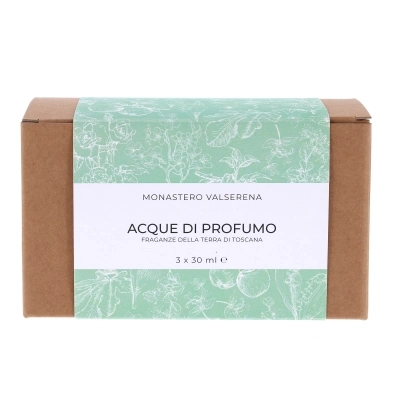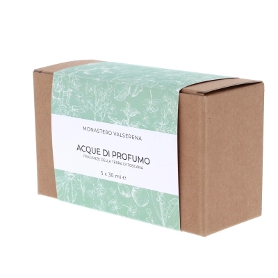 Cofanetto Tris Acque profumate Terre di Toscana delle monache Trappiste del Monastero di Valserena, contenente tre differenti fragranze ispirate alla dolcezza dei paesaggi collinari e suggestivi della Toscana, da 30 ml l'uno con vaporizzatore.