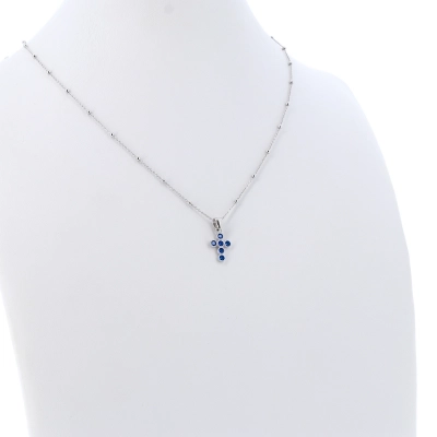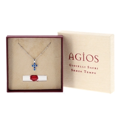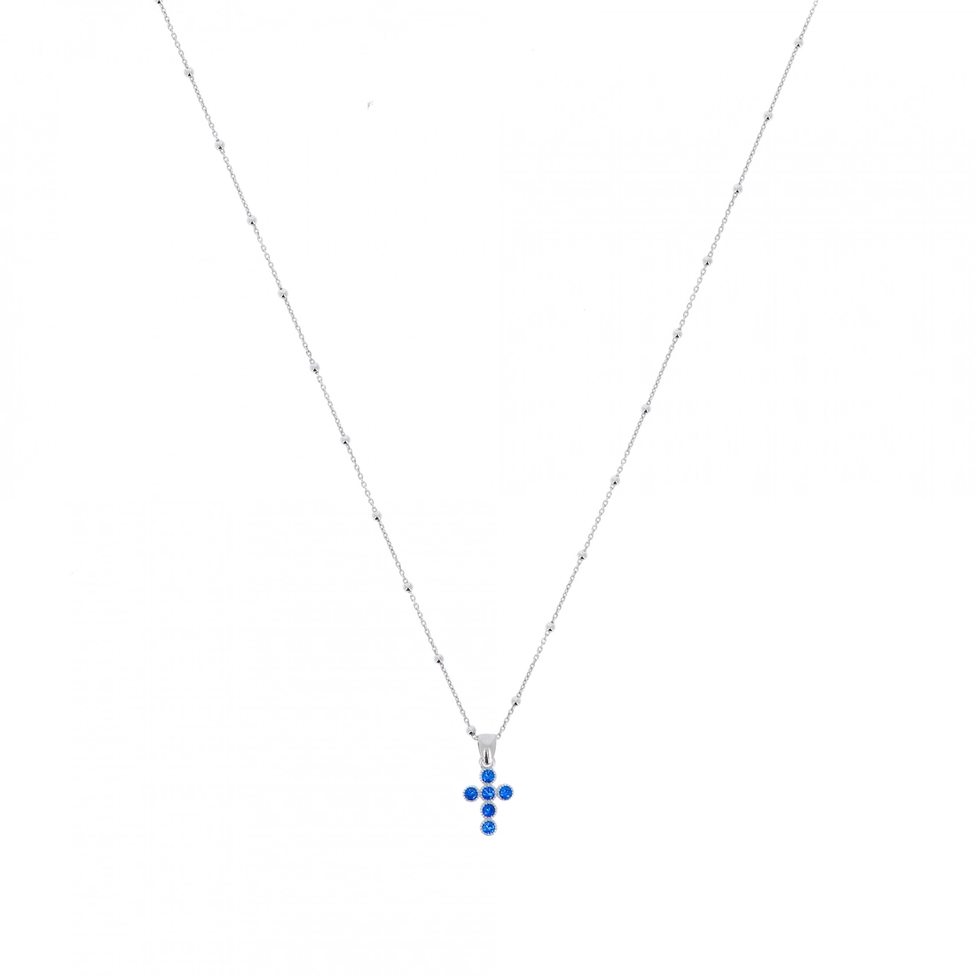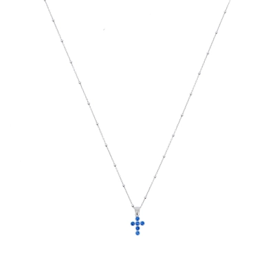 Deliziosa collana della circonferenza di 42 cm più 3 cm di allungo, in argento 925, con pendente crocetta di dimensioni 1,3x1 cm, impreziosita da zirconi blu. La catenina è semplice ma allo stesso tempo preziosa in quanto arricchita da piccoli grani che percorrono tutta la sua lunghezza.