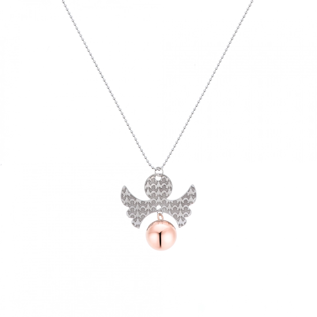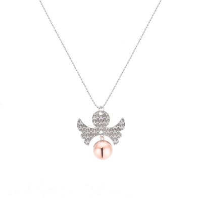 Il pendente presenta un ciondolo a forma di Angelo, finemente inciso, che apre le sue ali per custodire un campanellino dalla finitura rosata, il quale emette un suono leggero e rilassante, tipico dei chiama angeli per gravidanza, pensati per calmare e creare un legame speciale tra mamma e bambino. La catenina, composta da sfere metalliche collegate tra loro da piccoli segmenti, ha una circonferenza di 100 cm e una lunghezza perfetta per far appoggiare il ciondolo proprio sopra la pancia della mamma.