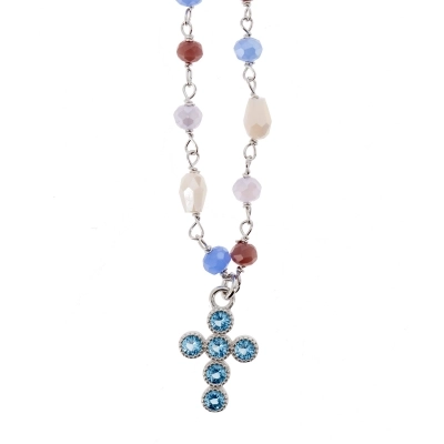 Deliziosa collana con pietre colorate sulle tonalità del blu, dalla circonferenza di 40 cm più 3 cm di allungo, con piccola crocetta pendente di dimensioni 1,3x1 cm, impreziosita da zirconi celesti, il tutto realizzato in argento 925 rodiato. La collana ha un peso di 7,3 gr.