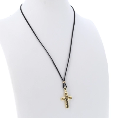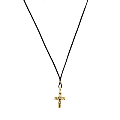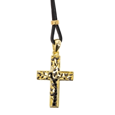 Deliziosa collana con cordoncino in pelle, dalla circonferenza di 46 cm e allungo di 4 cm, con pendente Croce, in argento 925 dorato, caratterizzato da una particolare lavorazione che ricorda un Albero della Vita con foglie in argento smaltato nero e una strisciolina di zirconi neri che impreziosisce tutta la collana. La croce ha dimensioni 3x2 cm.