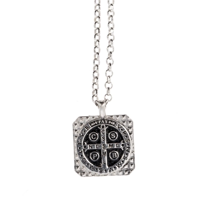 Catenina in argento 925 e medaglia di San Benedetto con finiture a contrasto argento rodiato e argento brunito. La dimensione del ciondolo con la medaglia di San Benedetto è di 1,5x1,5. Lunghezza catenina 45+3 cm.