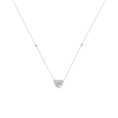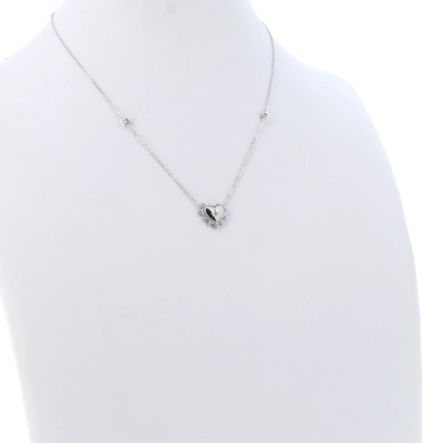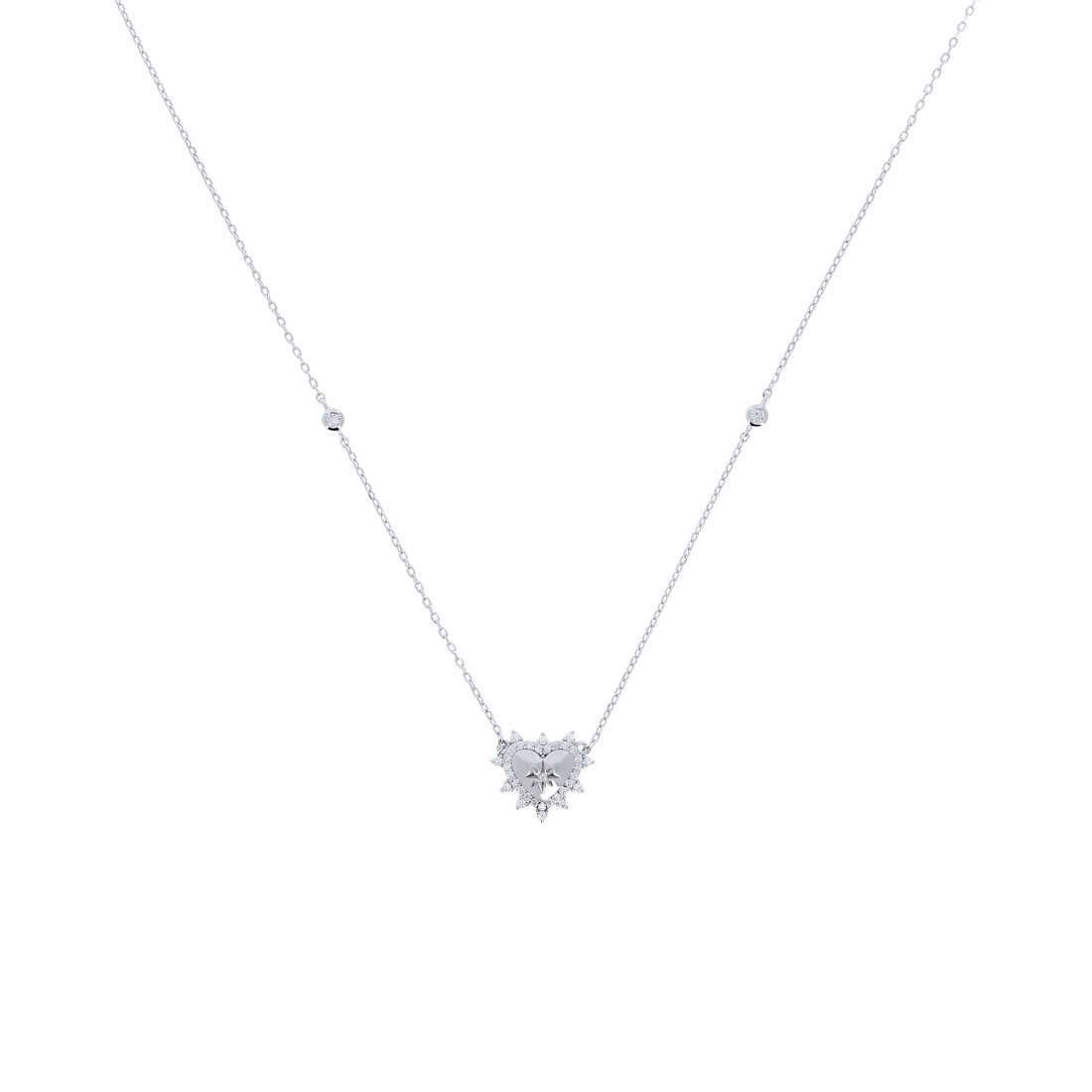 Deliziosa collana della circonferenza di 37 cm più 5 cm di allungo, in argento 925 e pendente a forma di Cuore dalle dimensioni di 1,8x1,6 cm, impreziosito da zirconi bianchi. La catenina e molto semplice ed elegante, ma arricchita da due punti luce posti vicino al ciondolo. La sola catenina pesa 4,4 gr.