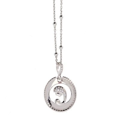 Deliziosa collana della circonferenza di 41 cm più 3 cm di allungo, in argento 925 e pendente ovale con all'interno una Madonna con Bambino dalle dimensioni di 2x1,5 cm, impreziosito da zirconi bianchi. La catenina è molto raffinata e semplice, ed è arricchita da piccoli grani che la percorrono per tutta la lunghezza. La collana pesa 6 gr.