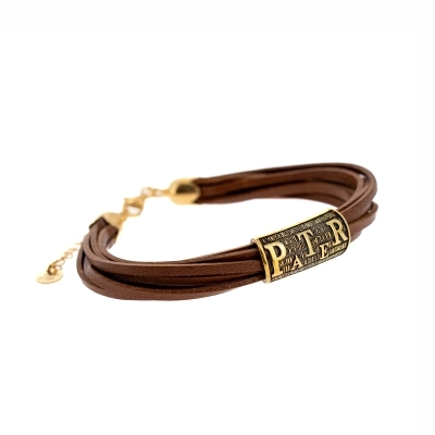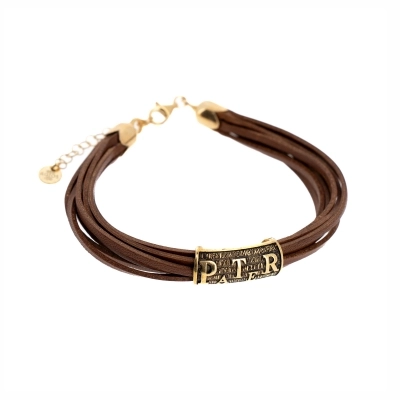 Bracciale Precem, dalla lunghezza di 17 cm più 3,5 cm di allungo, realizzato in pelle marrone. Al centro del bracciale è posto un inserto, in argento 925 con finitura dorata, in cui è incisa la preghiera del Padre Nostro in latino, che impreziosisce il bracciale e lo rende un articolo unico che unisce fede ed eleganza. Il Padre Nostro rappresenta l'unica invocazione che Gesù ci ha consegnato e che Lui stesso utilizza per rivolgersi a Dio.