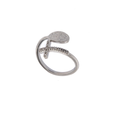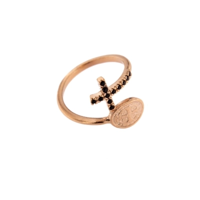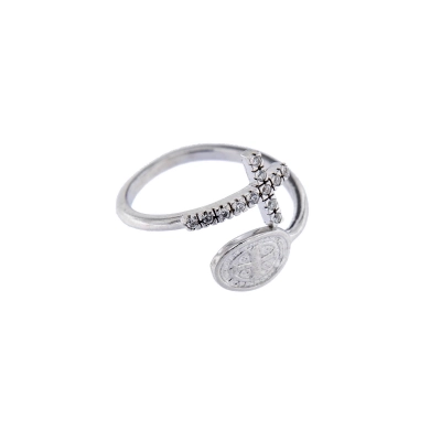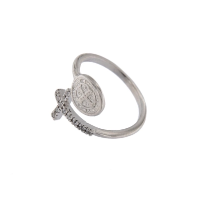 Anello regolabile, realizzato in argento 925, con croce con zirconi e medaglia di San Benedetto. E' un gioiello elegante e significativo. La croce simboleggia la fede e la spiritualità, mentre gli zirconi aggiungono un tocco di brillantezza ed eleganza. La medaglia di san Benedetto è un sacramentale della Chiesa cattolica, un segno sacro dal quale si ottengono effetti, grazie alla preghiera della Chiesa. Ma non basta farla benedire e portarla con sé: i benefici che desideriamo sono proporzionati alla crescita della nostra fede in Dio e nell’intercessione di san Benedetto.