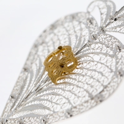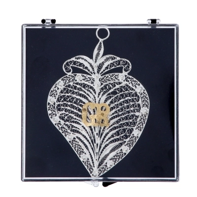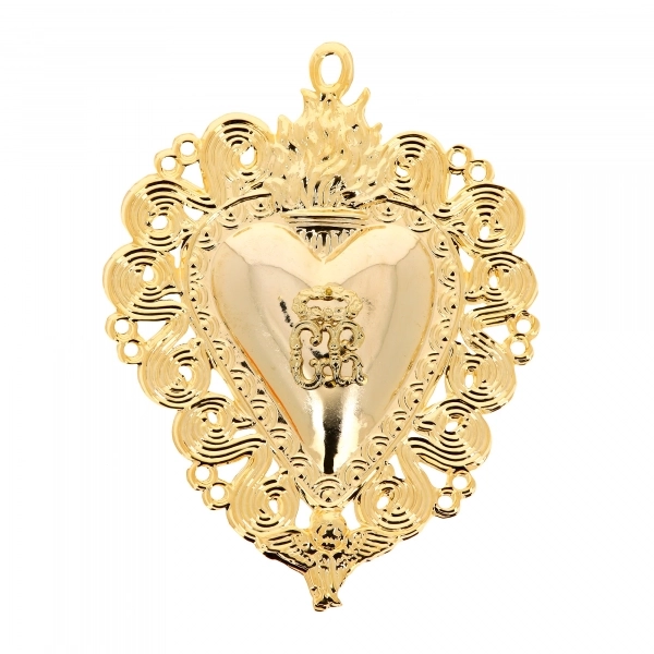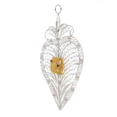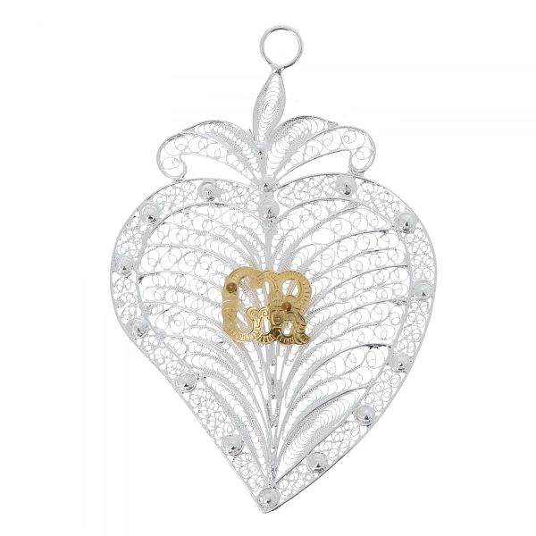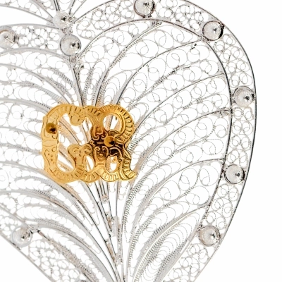 Elegante cuore votivo in filigrana d'argento, realizzato con lavorazione artigianale di alta qualità. Il design traforato, ricco di dettagli, mette in risalto al centro il raffinato monogramma dorato "GR" Grazia Ricevuta. Sulla parte alta, il cuore è dotato di un anellino, che permette di appenderlo in qualsiasi ambiente domestico.