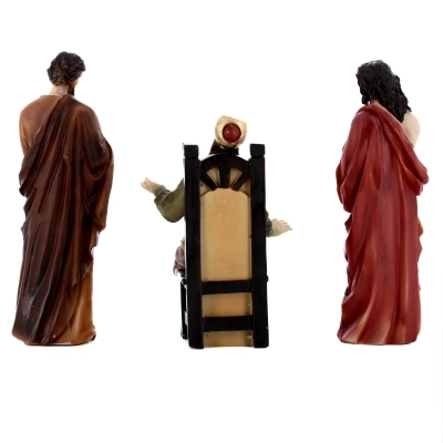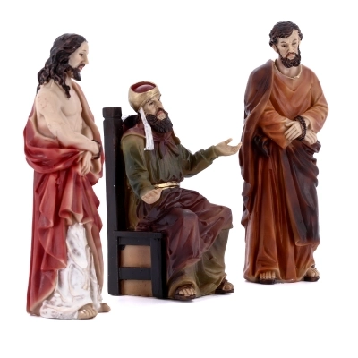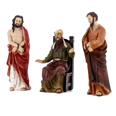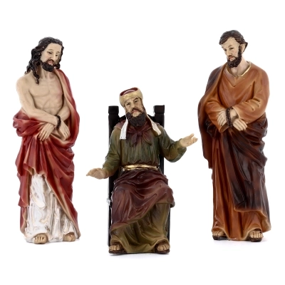 Set di tre statue raffiguranti: Caifa, Barabba e Gesù, in resina colorata. Queste statuette rappresentano una scena importantissima della vita di Gesù: il momento in cui Gesù viene condannato dopo il processo. Ideale per comporre il proprio presepe pasquale.