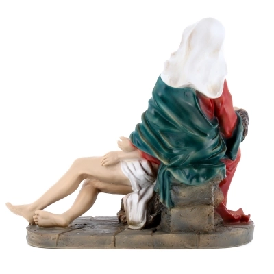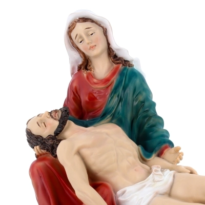 Bella statua in resina raffigurante La "Pietà", realizzata in resina colorata. Si tratta di una riproduzione della famosa scultura creata da Michelangelo che raffigura il corpo di Gesù Cristo sul grembo di sua madre Maria dopo la Crocifissione. L'originale si trova nella Basilica di San Pietro in Città del Vaticano. La scultura è rinomata per la sua intensità emotiva e la squisita maestria artistica.